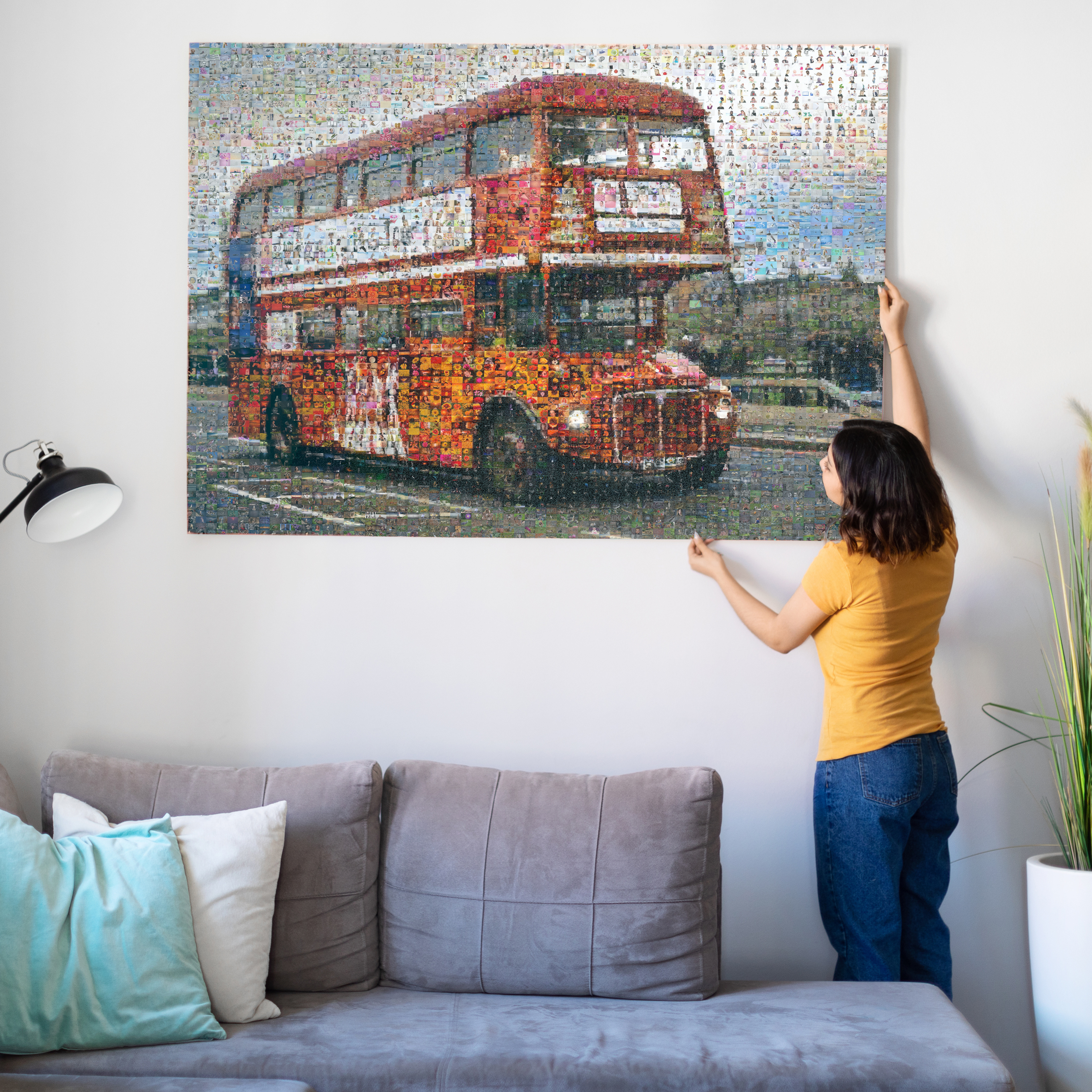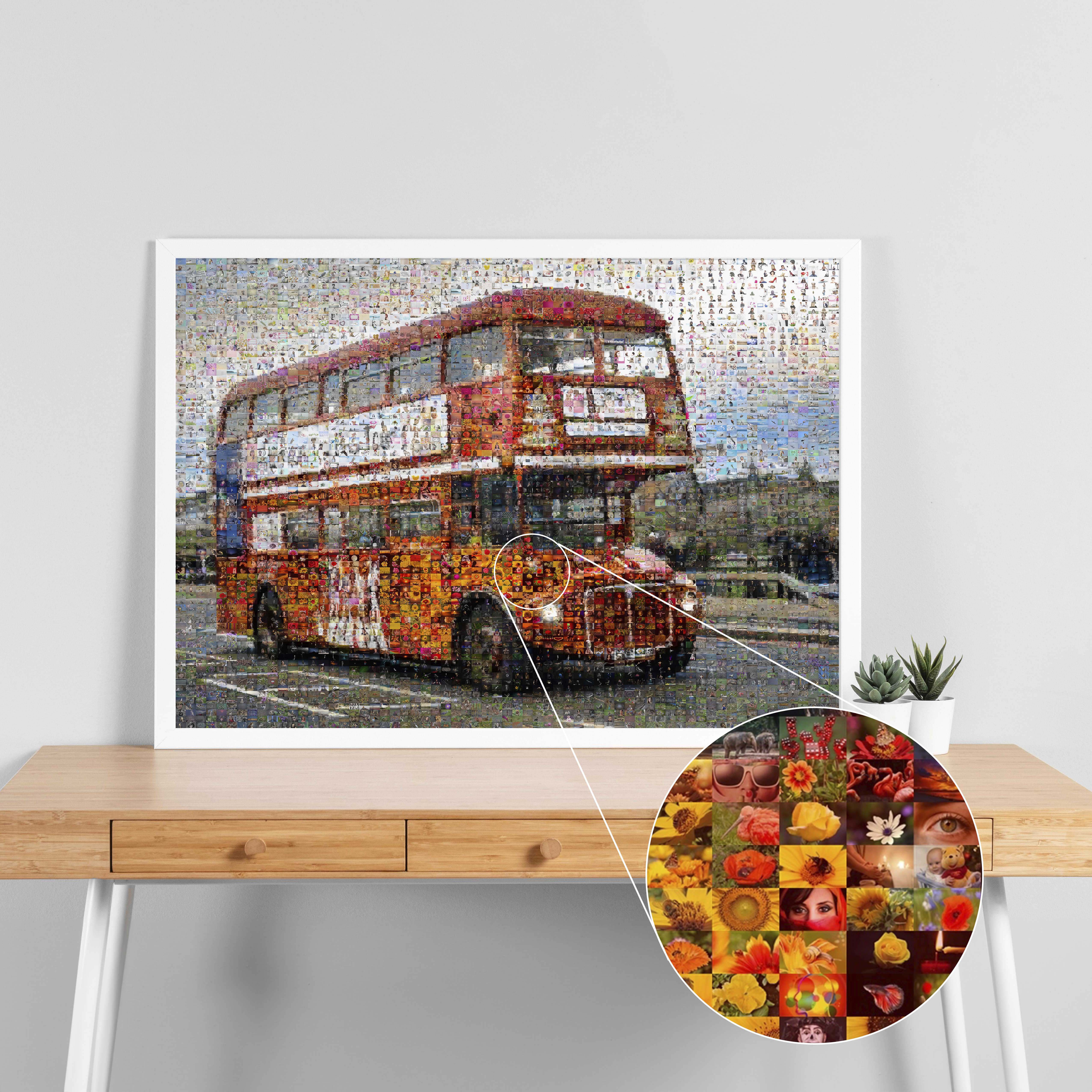 Verwandle deine Urlaubserinnerungen in ein atemberaubendes Kunstwerk! Stell dir vor, dein Lieblingsmoment in London, eingefangen in einem roten Double-Decker-Bus, zusammengesetzt aus unzähligen kleinen Momentaufnahmen deiner Reise.